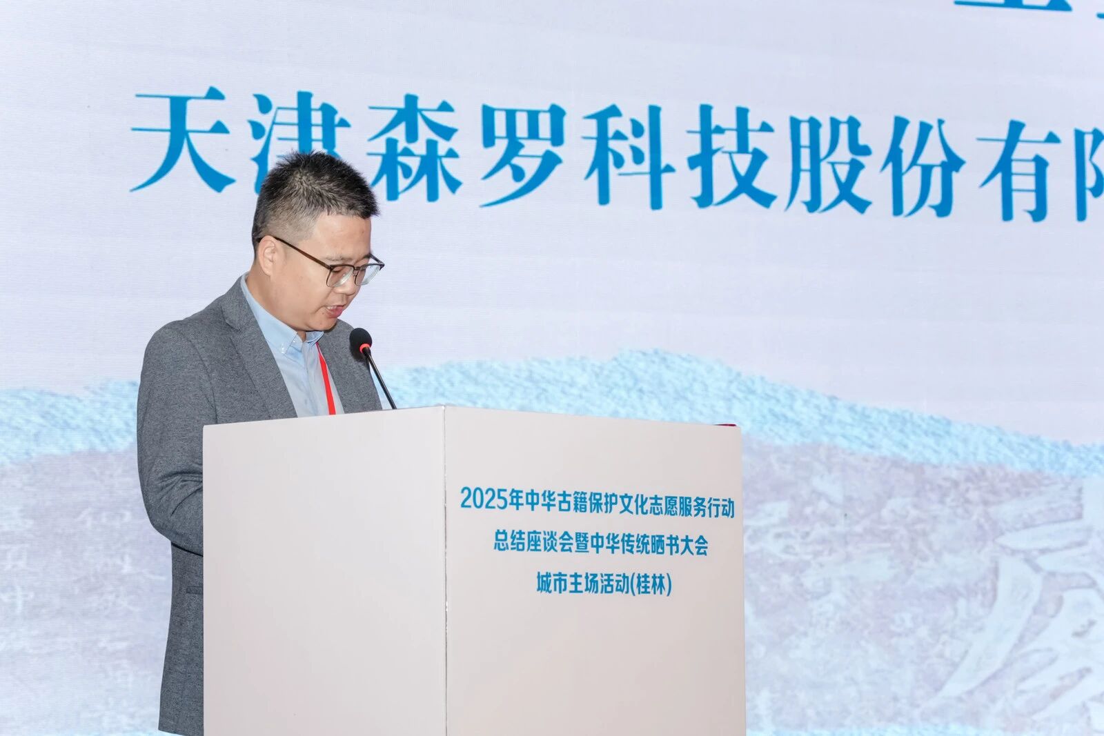 在志愿服务行动总结座谈会上,森罗股份文博事业部总经理王金良作为公益资助单位代表发言,介绍了公司在古籍保护领域的技术实践与创新成果。他首先对中国古籍保护协会、古籍保护志愿者、各地图书馆老师致以了诚挚谢意,并表示,森罗十分有幸与古保协会十年携手,以技术之力参与了这场文脉守护工程。未来,企业还将从技术赋能、多元合作、宣传推广、标准共建等多方面,为古籍的长期保存与活化利用提供坚实支撑。