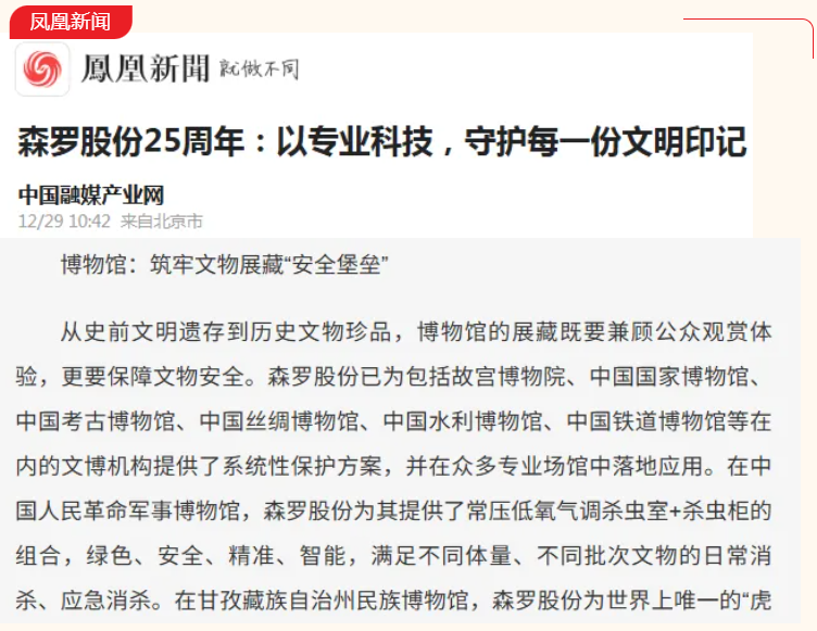 日前,百余家媒体纷纷转载报道《森罗股份25周年:以专业科技,守护每一份文明印记》。文章以典型案例为引,通过多场景呈现高性能文保装备在博物馆、图书馆、纪念馆、档案馆、美术馆、考古院及私人收藏等领域的应用成效与客户赞誉。