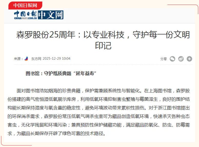 25年,是时间长河中的一粟,却足以让一颗守护文明的种子生根发芽、枝繁叶茂。天津森罗科技股份有限公司(以下简称:森罗股份)自成立以来,始终秉持“科技守护文明”的使命,致力于为珍贵文化遗产构建气密、恒湿、洁净、低氧、稳定、节能的预防性保护环境。凭借自主核心技术与专业服务,已成为数百家博物馆、图书馆、纪念馆、档案馆、美术馆、考古院(考古发掘)及私人收藏机构的信赖之选,从常压低氧气调杀虫系统到超高密封展柜,从恒温恒湿低氧展示库房到节能型恒湿洁净储藏柜,森罗股份以科技之力,让千年文脉在时光长河中恒久焕彩。
